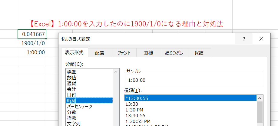 エクセルで1900/1/0を表示させる方法と設定の変更